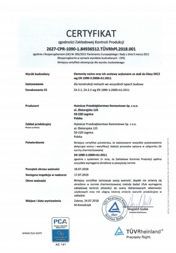 Certyfikat zgodności Zakładowej Kontroli Produkcji